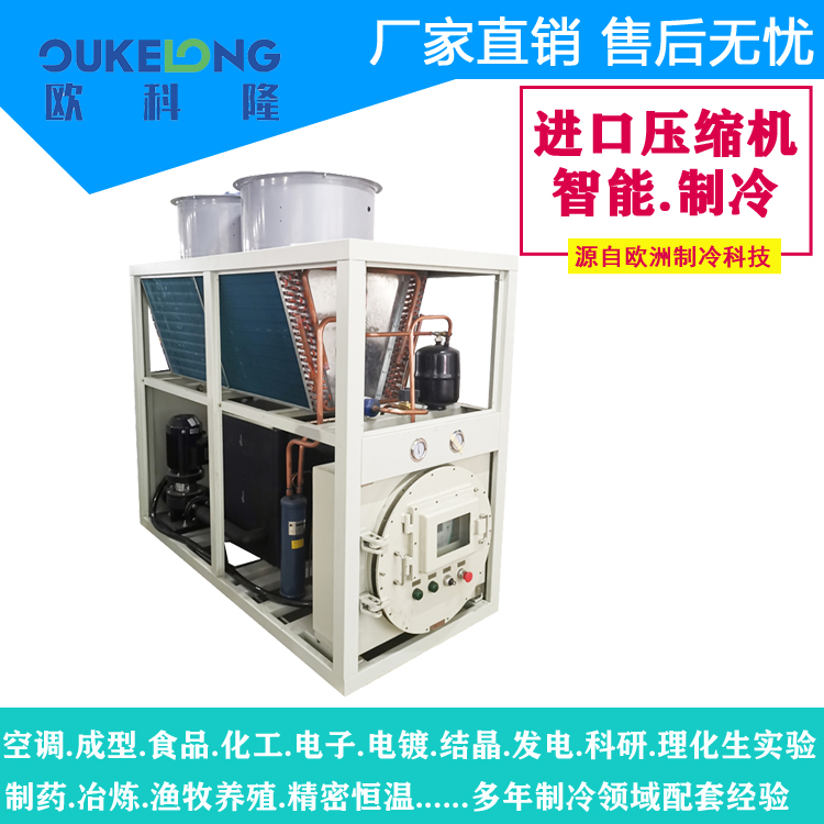 風冷箱式防爆冷水機是歐科隆制冷打開市場的拳頭產品,歐科隆制冷擁有廣泛的防爆冷水機配套經營,包括臭氧發生器,甲烷發電,化工化纖,石油天然氣,新型環保行業等,歐科隆防爆冷水機采用隔爆、增安、本安、正壓、充油、充砂、無火花、澆封和氣密等多種防爆方式,使機組可以在易燃易爆場合使用。